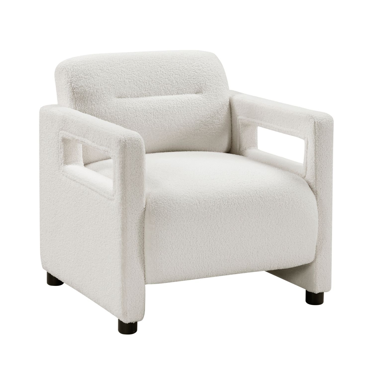 Elevate your living space with the modern elegance of this beige boucle armchair. Featuring a sturdy plywood frame and foam padding over pocket coils, this chair offers exceptional comfort and support. The luxurious boucle fabric upholstery adds a touch of sophistication, while the clean lines and contemporary design enhance any room's aesthetic. The attached back and seat cushions provide a seamless look and feel, and with a 300lb weight capacity and easy assembly, this armchair is perfect for creating a stylish and inviting atmosphere in your living room, bedroom, or reading nook.PRODUCT DIMENSIONS: Overall Dimension: 30" x 31.5" x 30.5"HSeat Width: 24"Seat Depth: 22.5"Seat Height: 18.5"Arm width: 3"Arm height: 25"Leg height: 2"Listing Includes: One Accent Chair Only.End-table: Not included.Simple Assembly Require